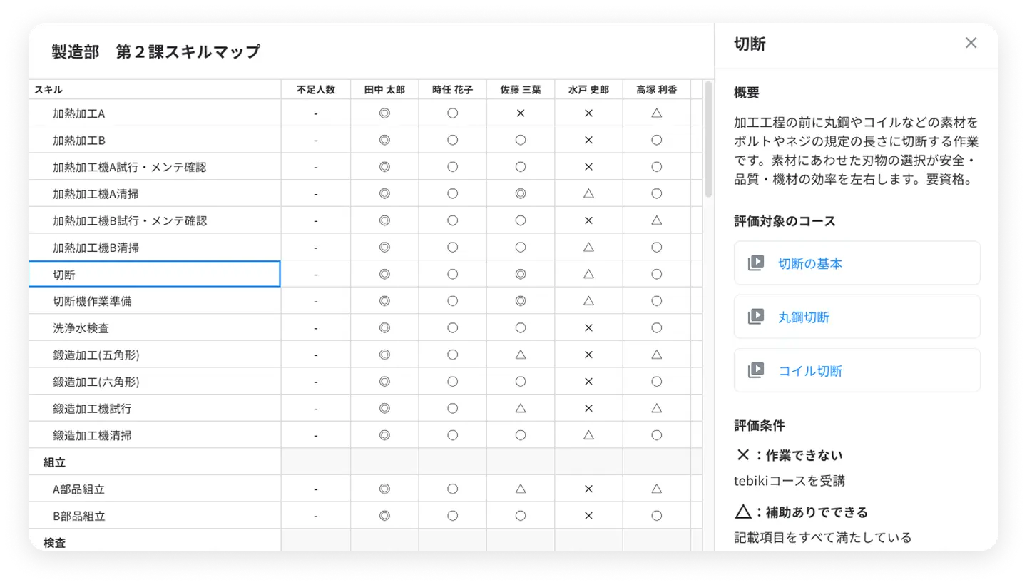 例えば「従業員のスキルマップとマニュアルが紐づいたようなツール」だと、「誰がどんなスキルを習得できていなくて、そのためにどのマニュアルを理解してもらう必要があるのか」が可視化されます。以下はその画面の例です。
